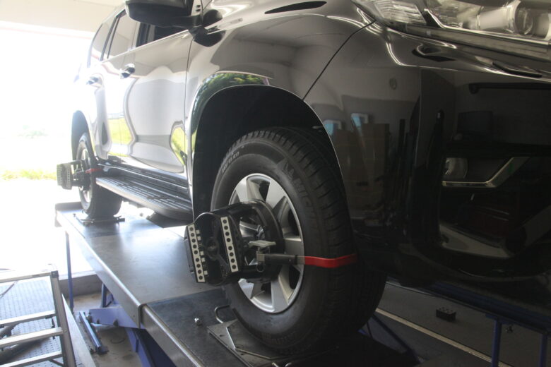 これは応急タイヤがついていないので車高に変化がでたかリフトアップ時のラテラルロッドだけでの左右差をあわせになりますのでブッシュがボディが前方向になっているのかですかね。