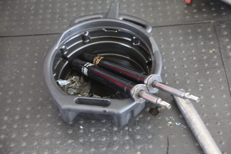 通常問題がなければカートリッジ式のショックはショックの上部を緩めてOILを抜いていきますがかなりトルクで締め上げられていて全く緩みません。