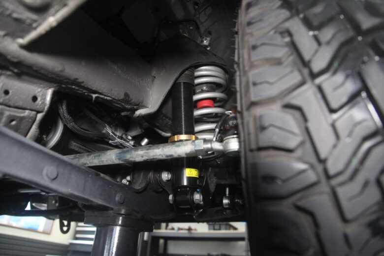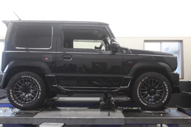 ジムニーの車高ダウンの作業です。商品はレインボーオート ダウンスプリング、コンクエストダンパー、ラテラルロッド前後 RIMコーポレーション ショートバンプストッパー前後の取り付けです。