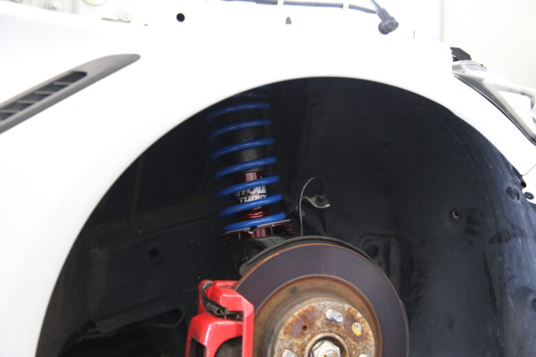 組付けまではお客様が行っていますがトップマウントはまだ締め付けされていませんので締め付けをして交換をしていきます。